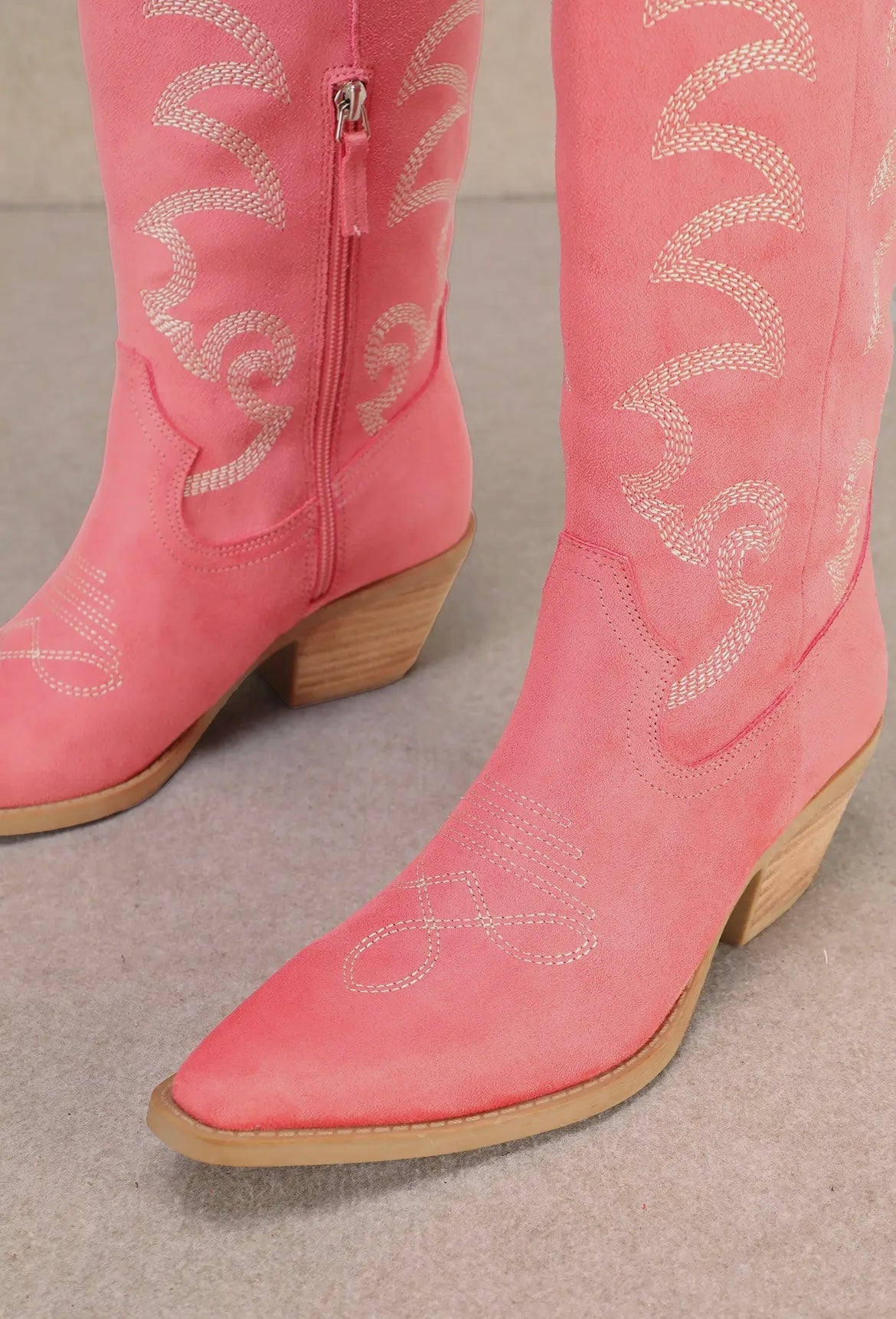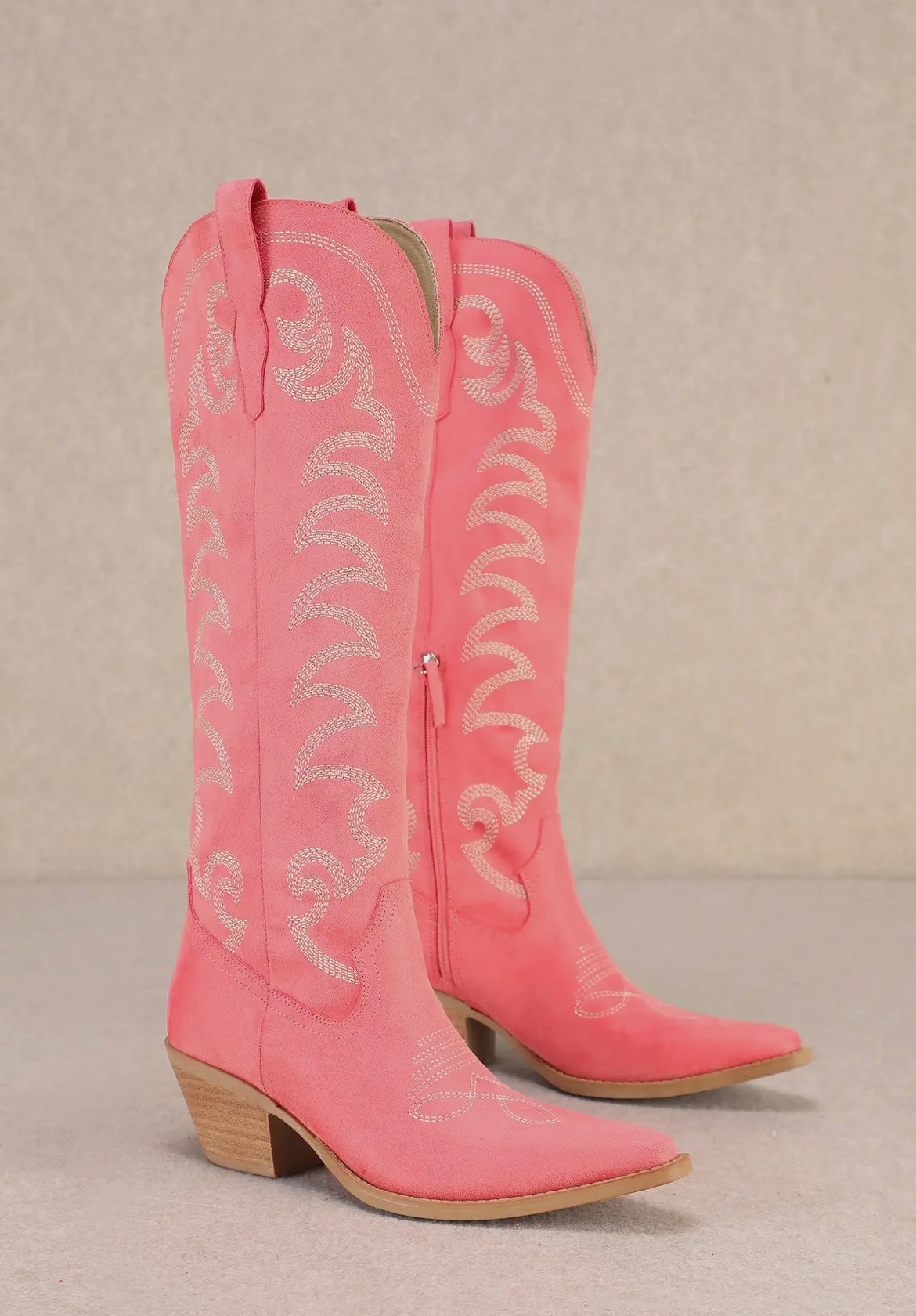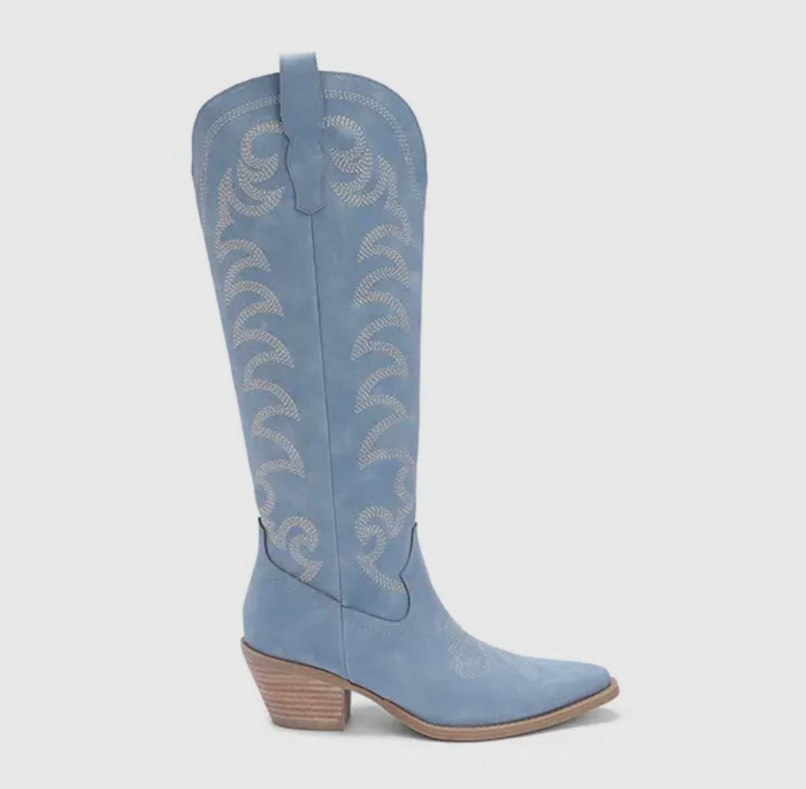 Step into western elegance with the Faye Suede Western Boot. Crafted in a soft pastel blue suede, this tall silhouette is adorned with sweeping white embroidery that brings movement and artistry to its classic design. The pointed toe, stacked block heel, and pull-on tabs nod to timeless cowboy tradition, while the sky-toned finish adds a fresh, modern twist.