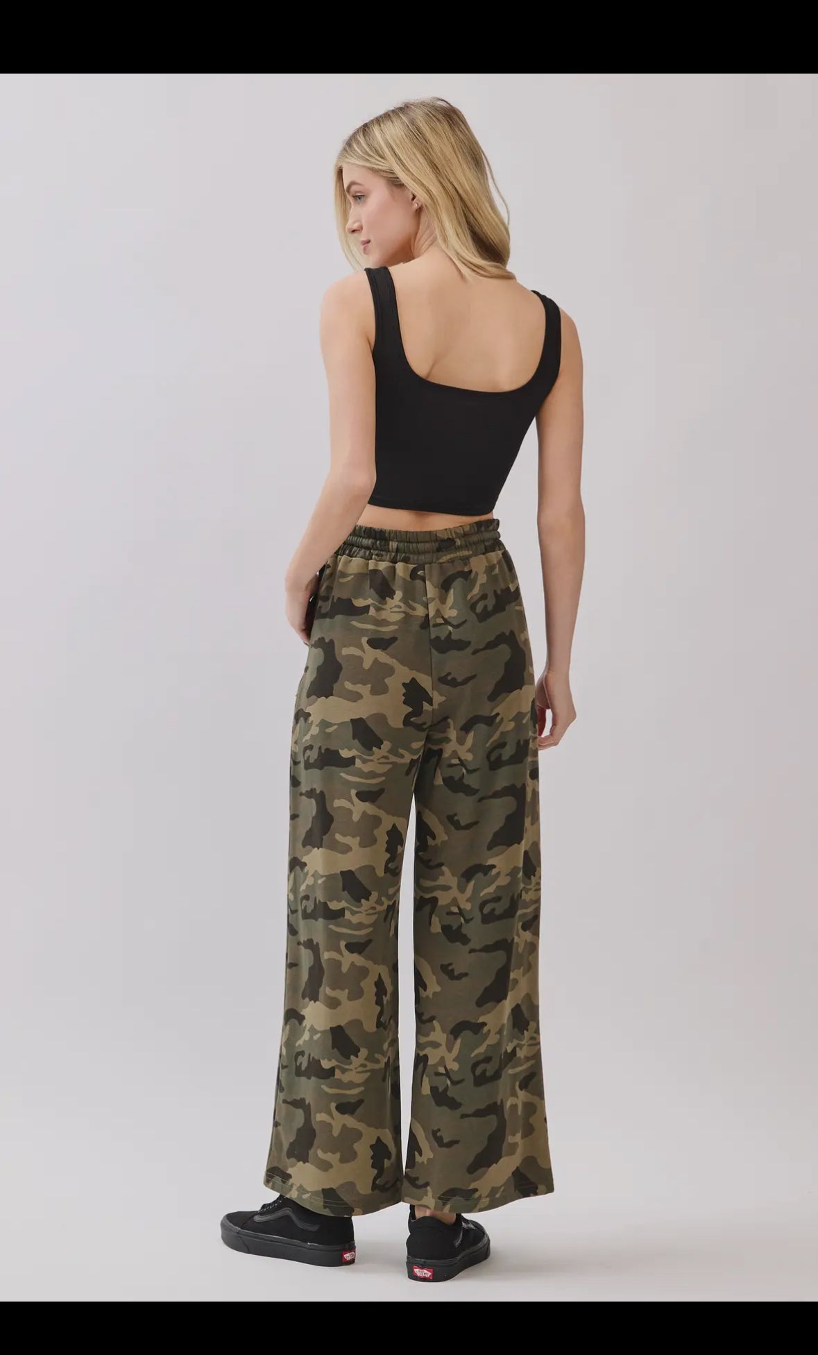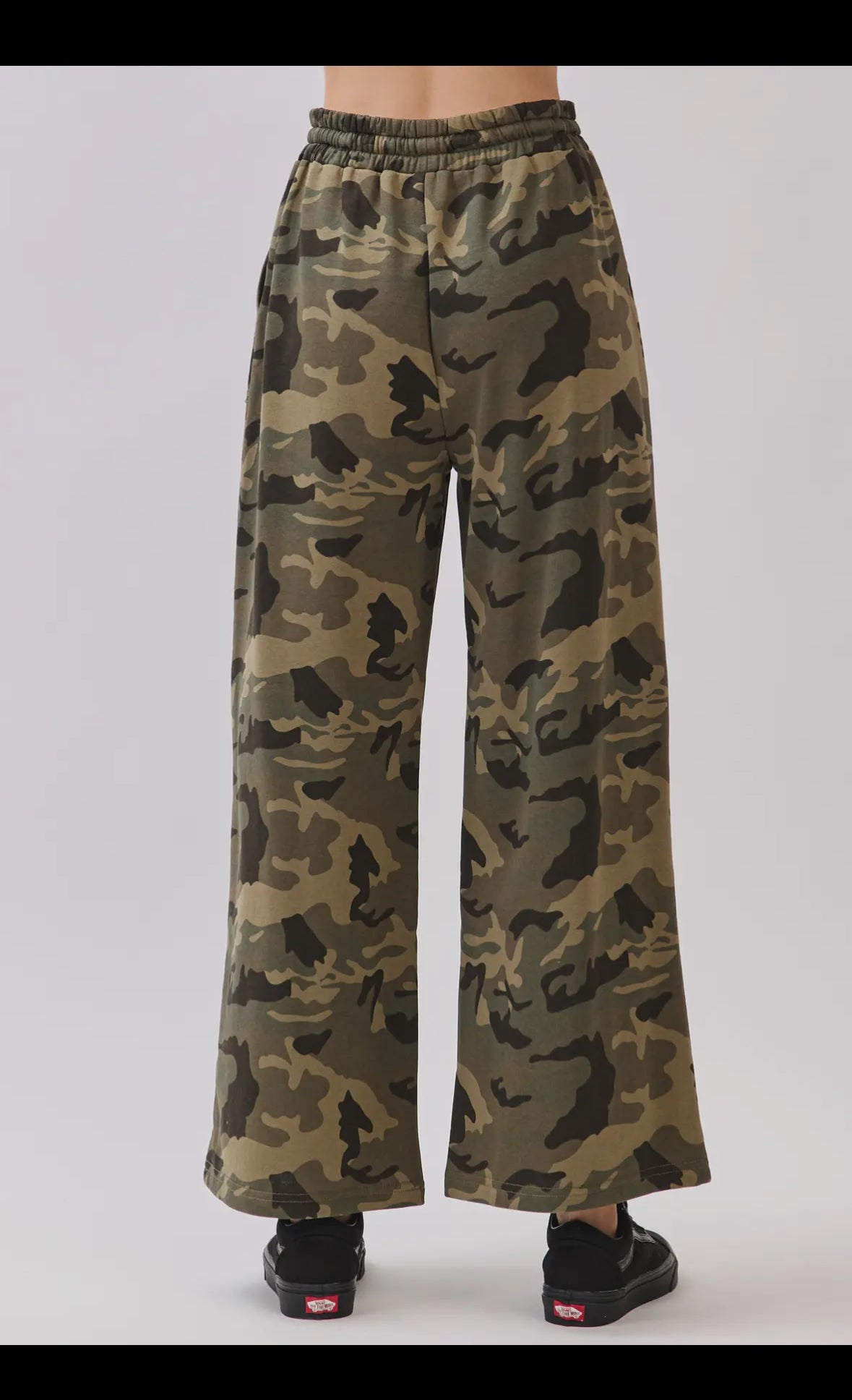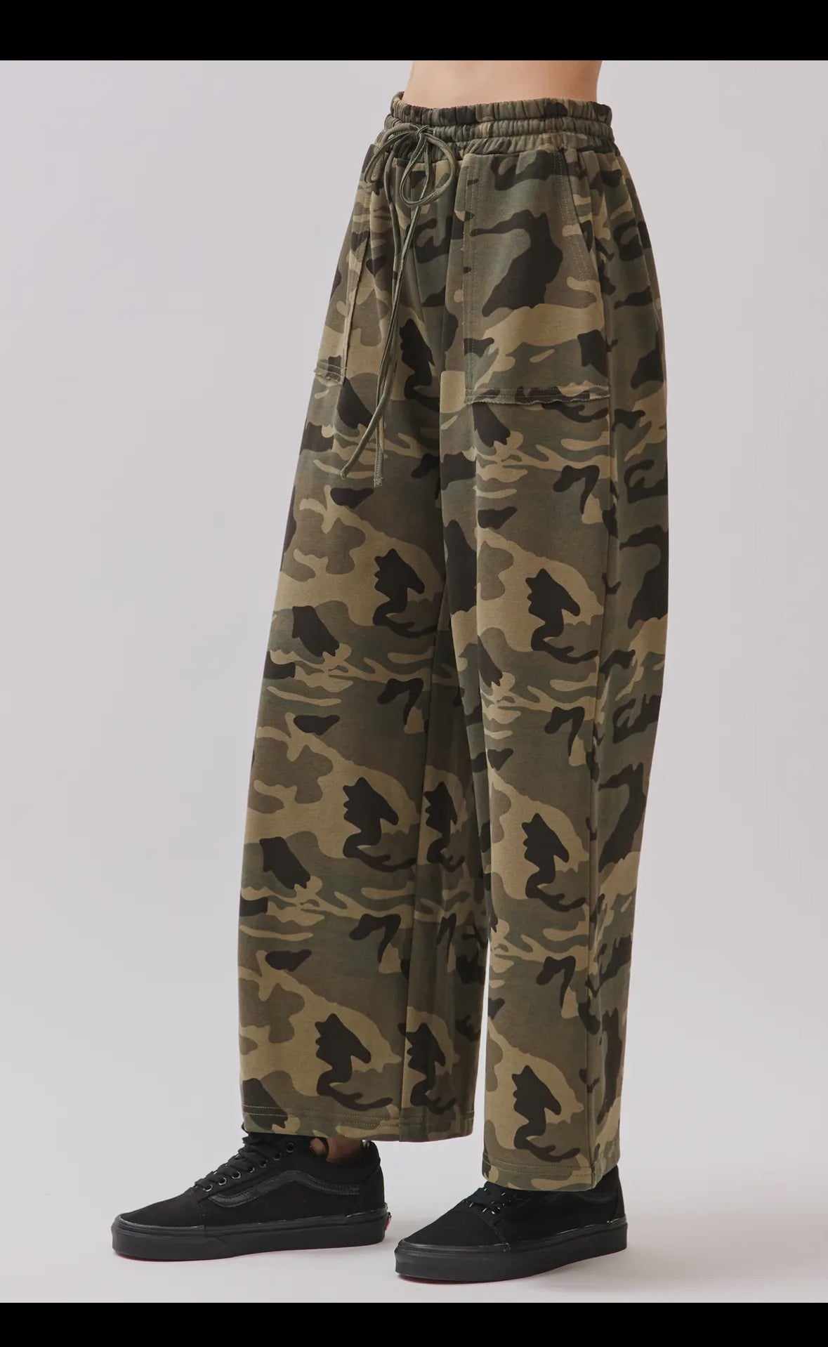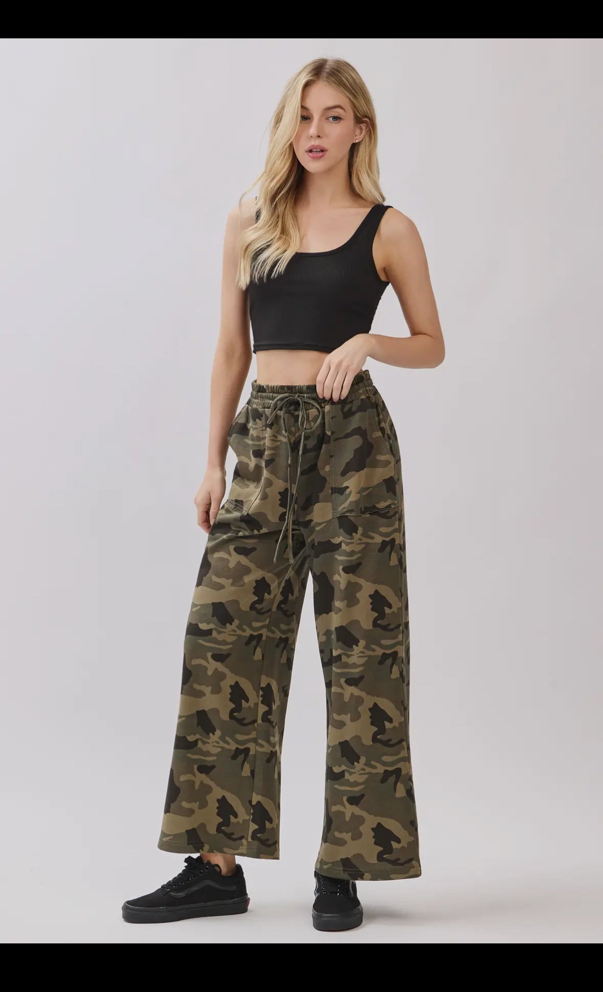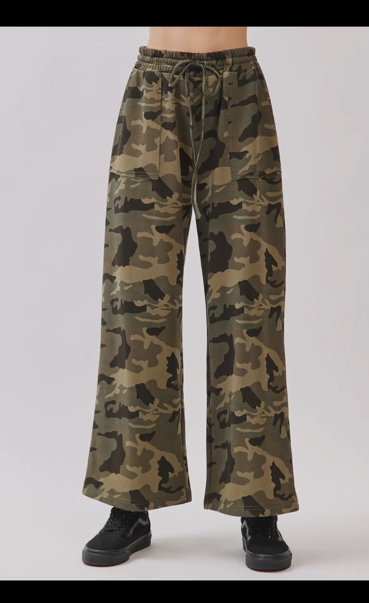 Effortless and versatile, these camo wide leg pants feature a relaxed silhouette with an elastic drawstring waistband and roomy front patch pockets. Perfect for off-duty days, gameday styles, or casual streetwear looks. Lightweight and easy to pair with tanks, tees, or hoodies.camo pants, camouflage, wide leg pants, drawstring waist, casual bottoms, relaxed fit, streetwear, gameday outfit, military print, comfy pants, everyday wear