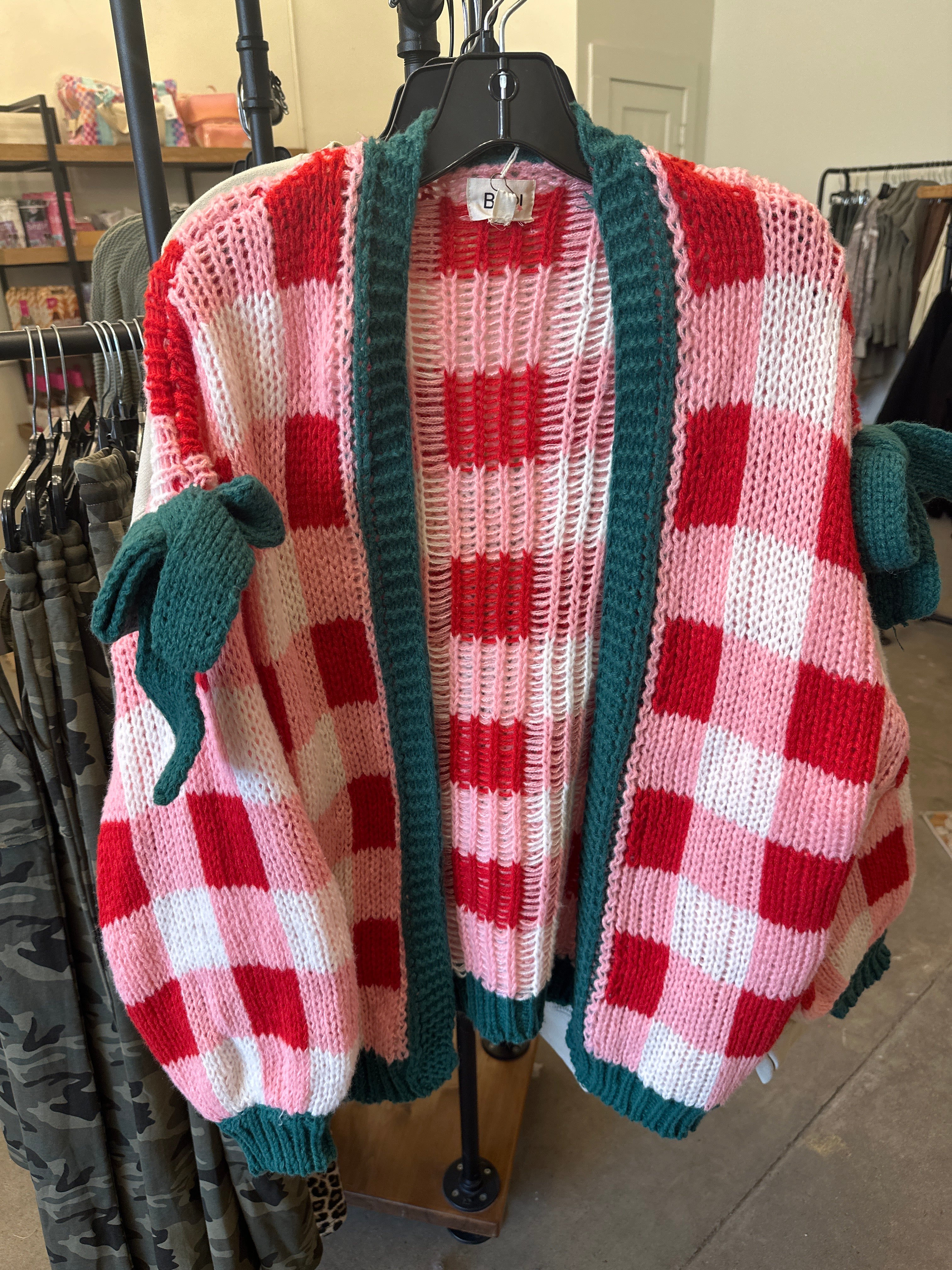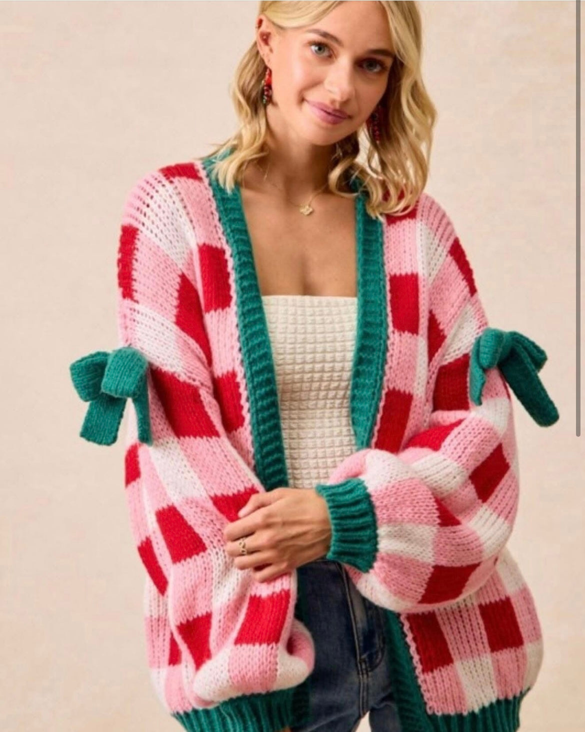 Multi colored checkered open front knit cardigan. Green ribbon detail.