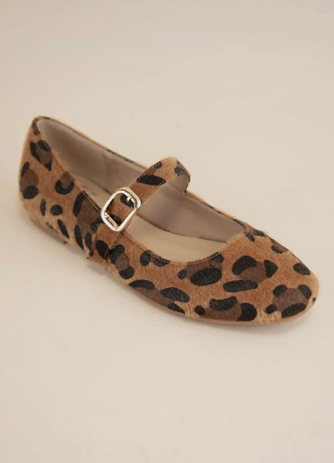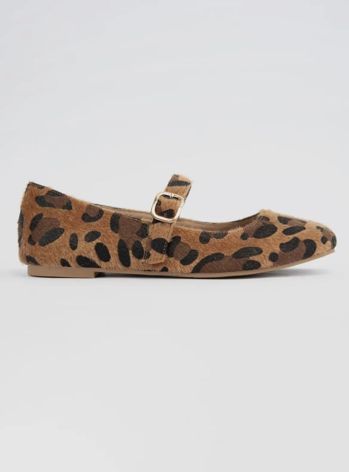 The upper features a unique short hair fur finish in a chic animal print, adding a luxurious texture and a bold pattern to your look. Each shoe is designed with a classic buckle strap across the foot for a secure and comfortable fit. The flat sole and timeless silhouette make them an ideal choice for all-day wear. Available in a variety of fashionable prints, these flats are a must-have for elevating any outfit with a touch of playful sophistication.