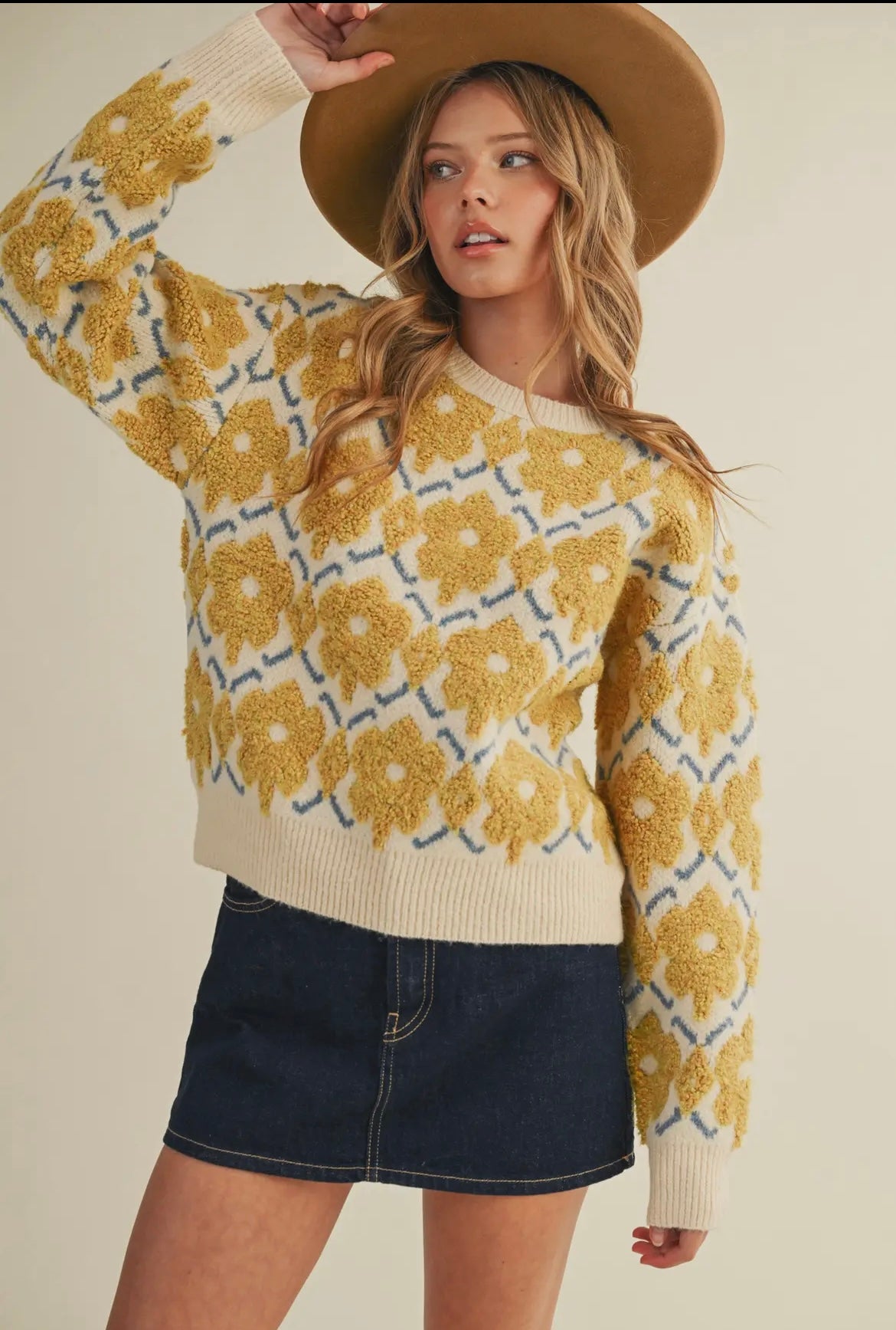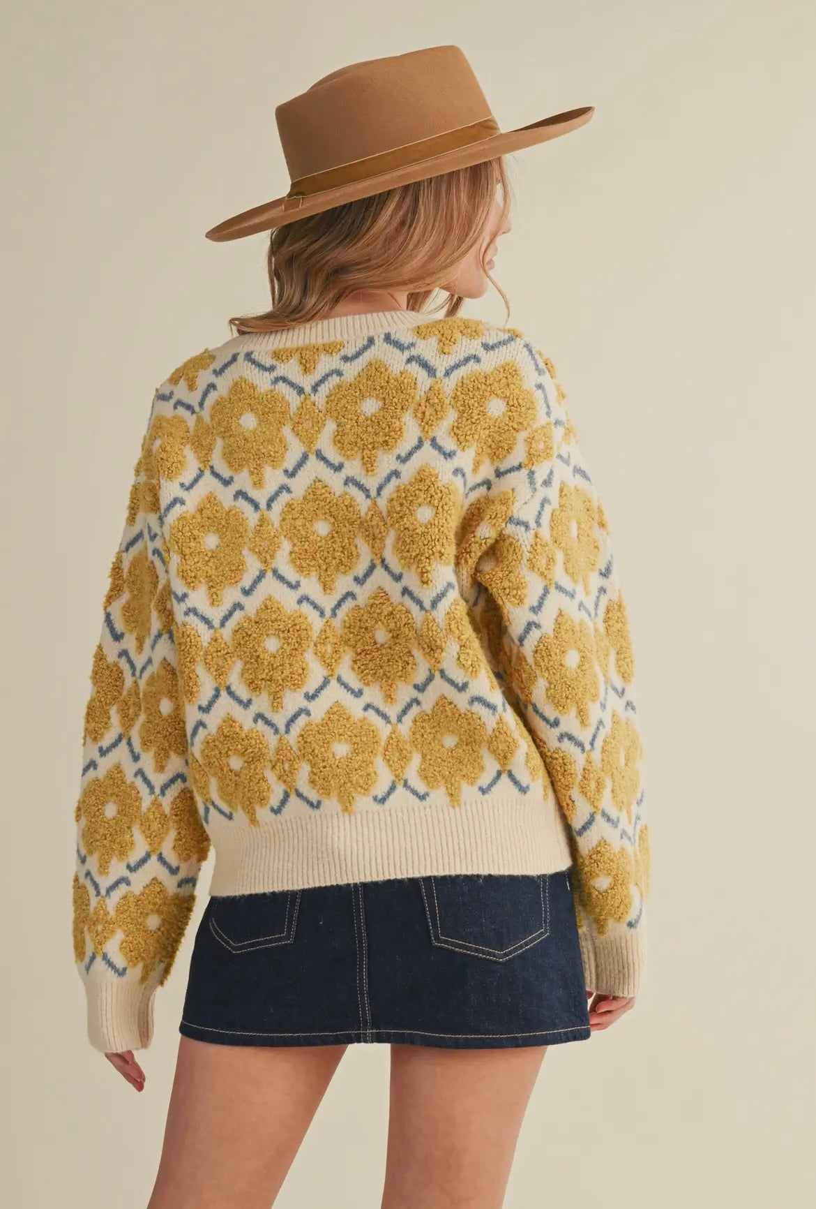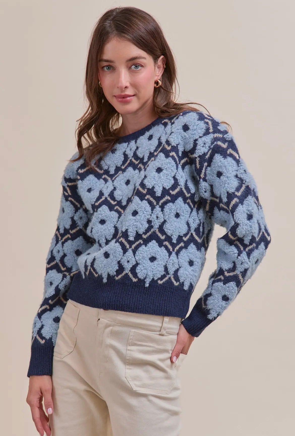 + Floral pattern in fuzzy knit + Ribbed neckline, cuffs, and hem + Model is 5' 7.5" 30-25-36 and wears a S