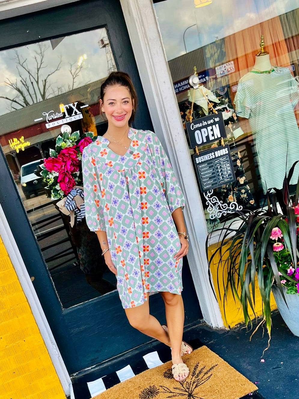 Introducing our stylish Green Geometric Floral Dress FB! Made with an ultra-soft fabric for maximum comfort, this dress features 3/4 sleeves, a flattering V-neckline, and a loose fit. Perfect for any outing, pair it with strappy heels and hoops for an on-trend look.