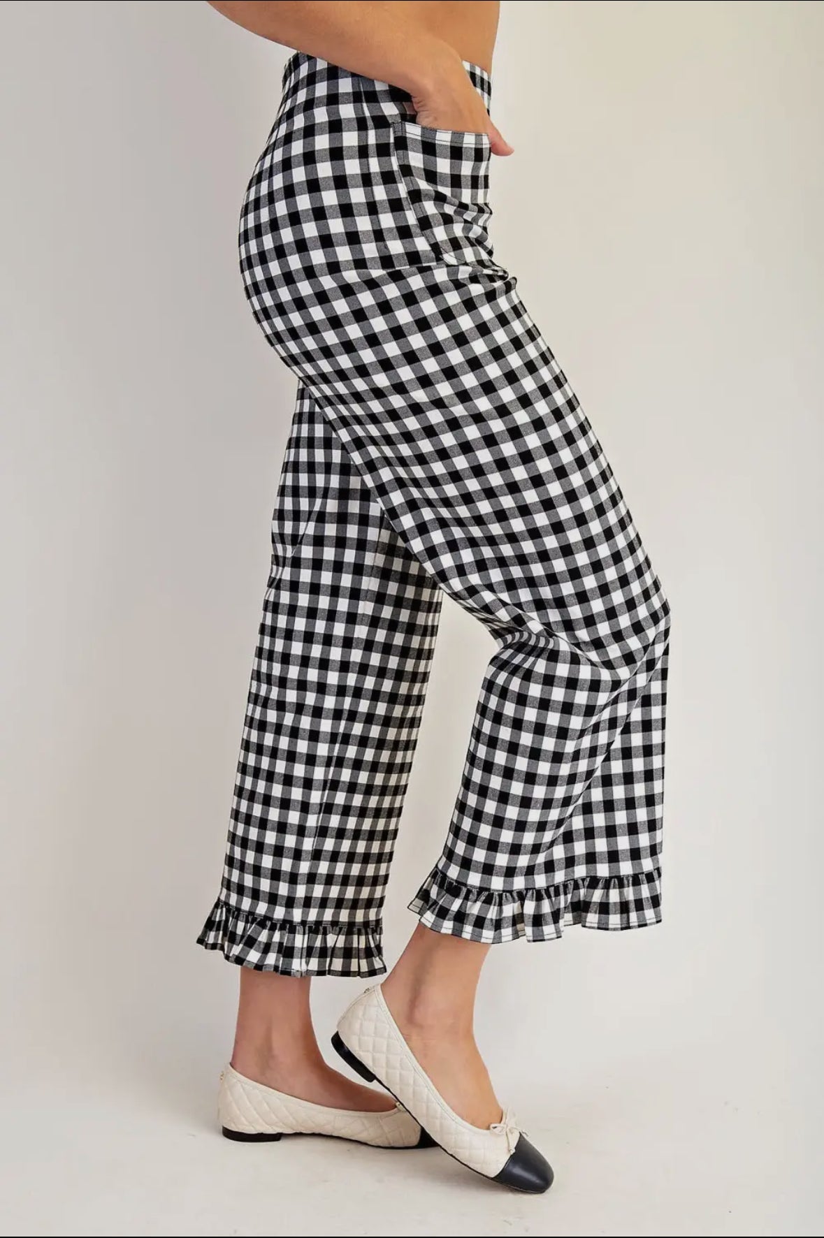 Gingham ruffle trim straight leg pants ft front patch pockets and a hidden back zipper closure