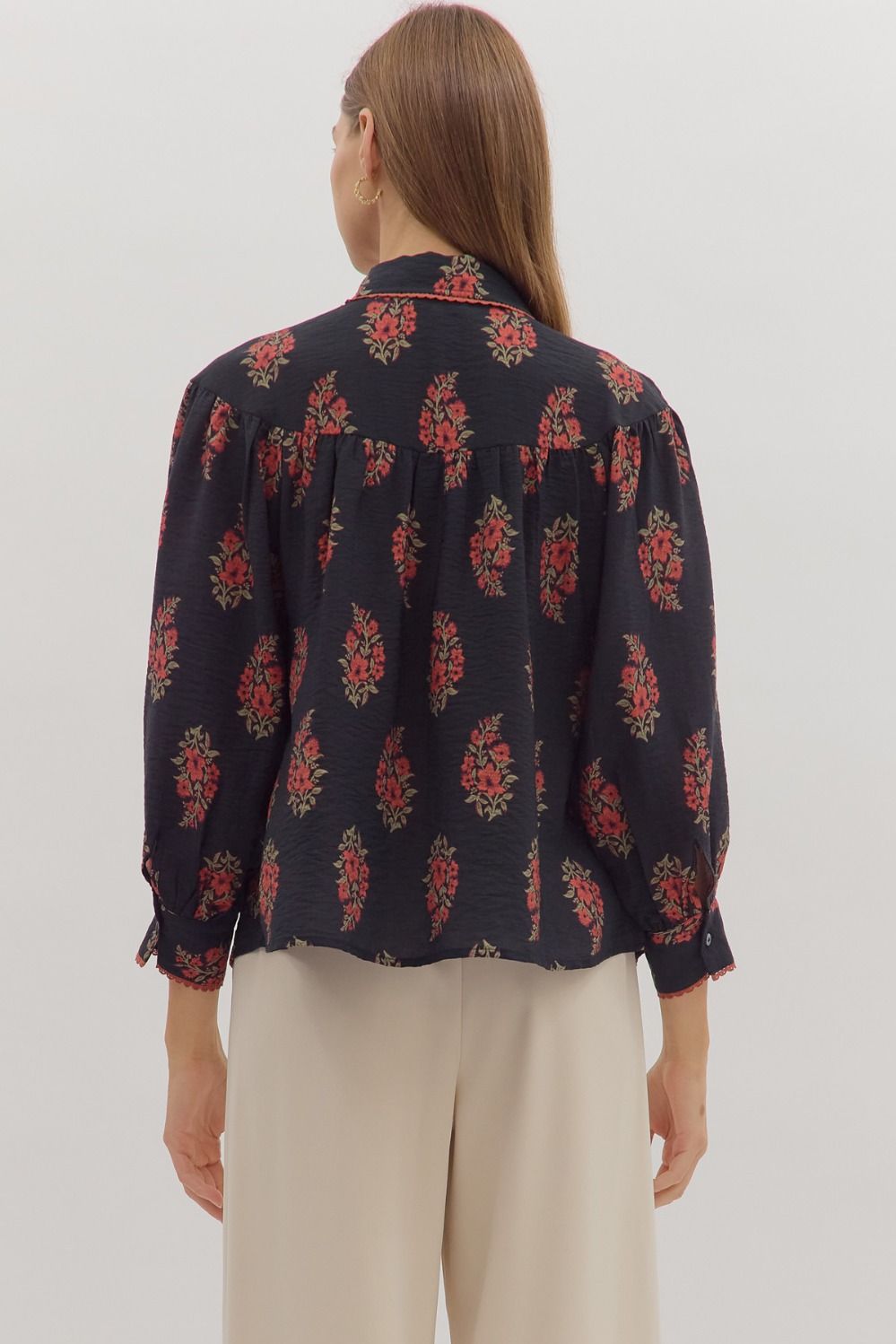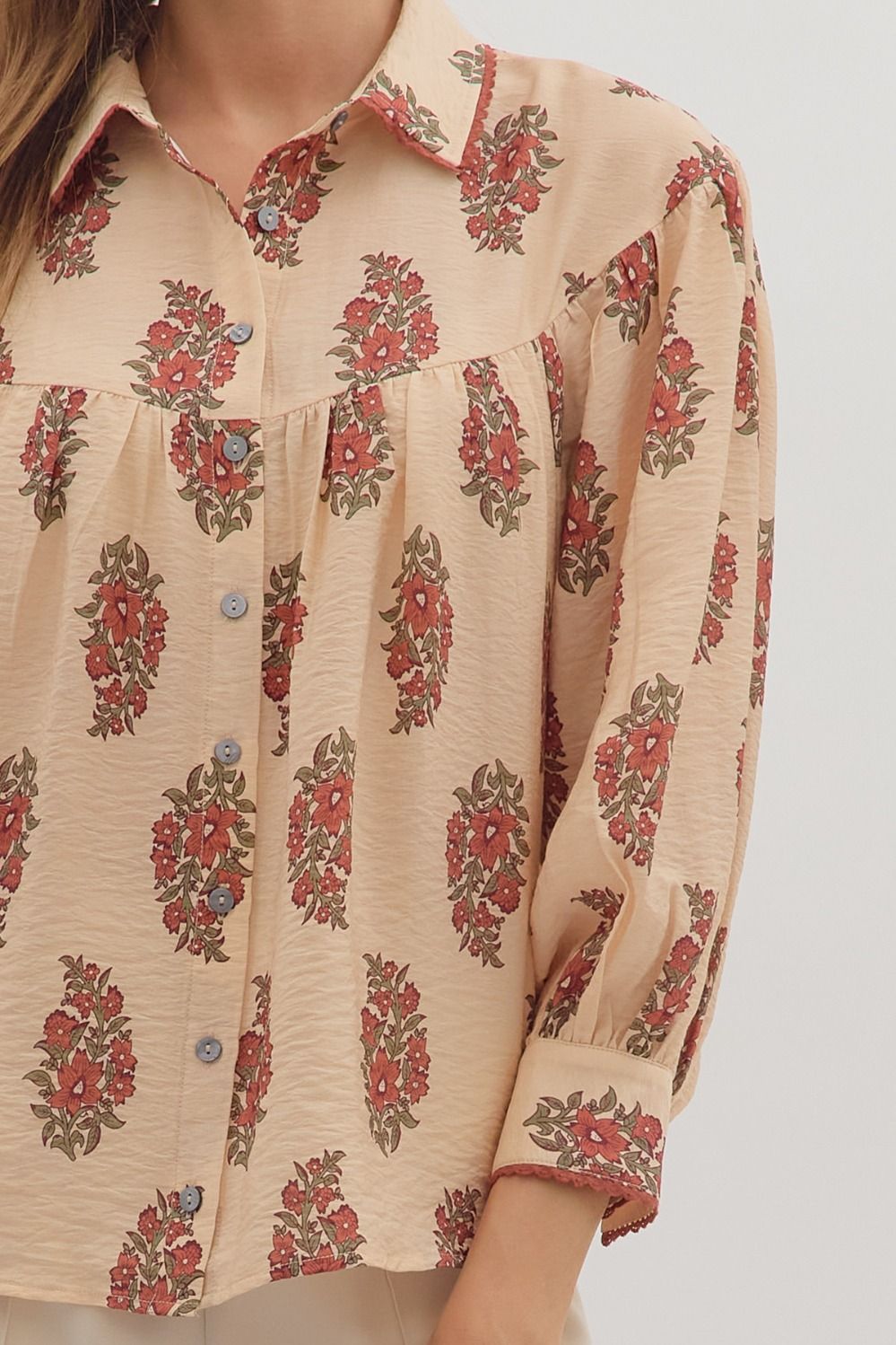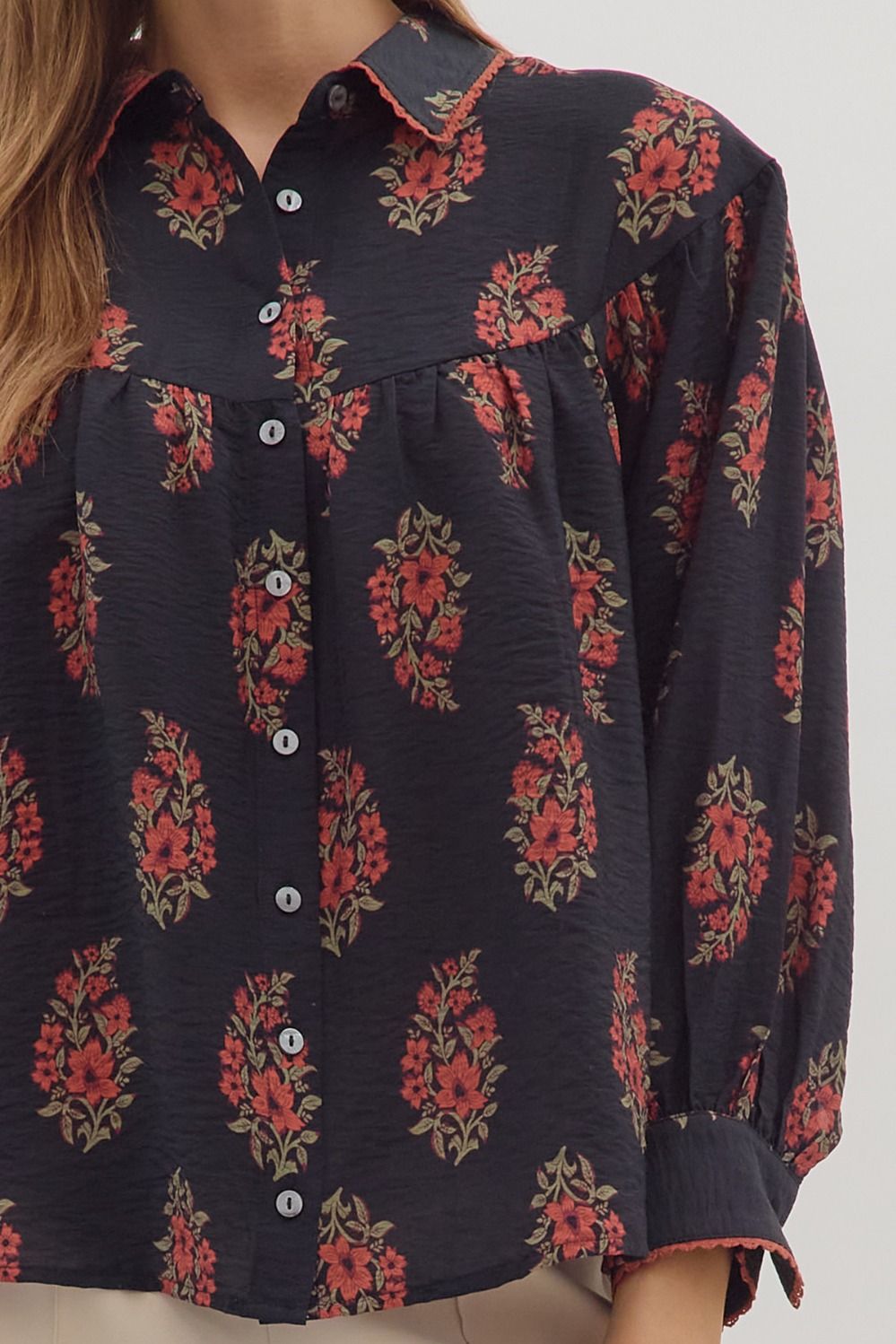 Floral print long sleeve button-down top featuring pleated yoke detail at front and back. Shirt collar.