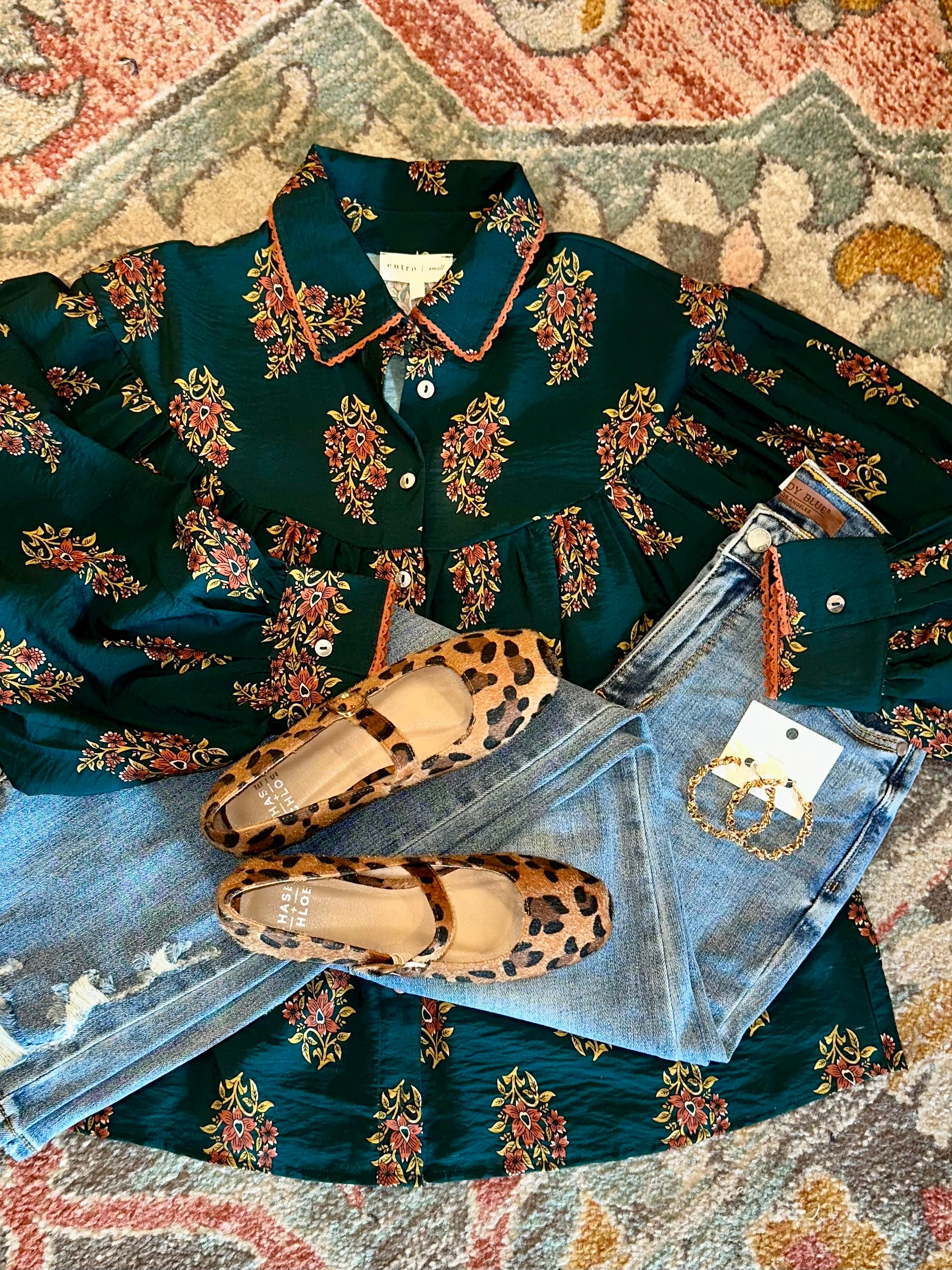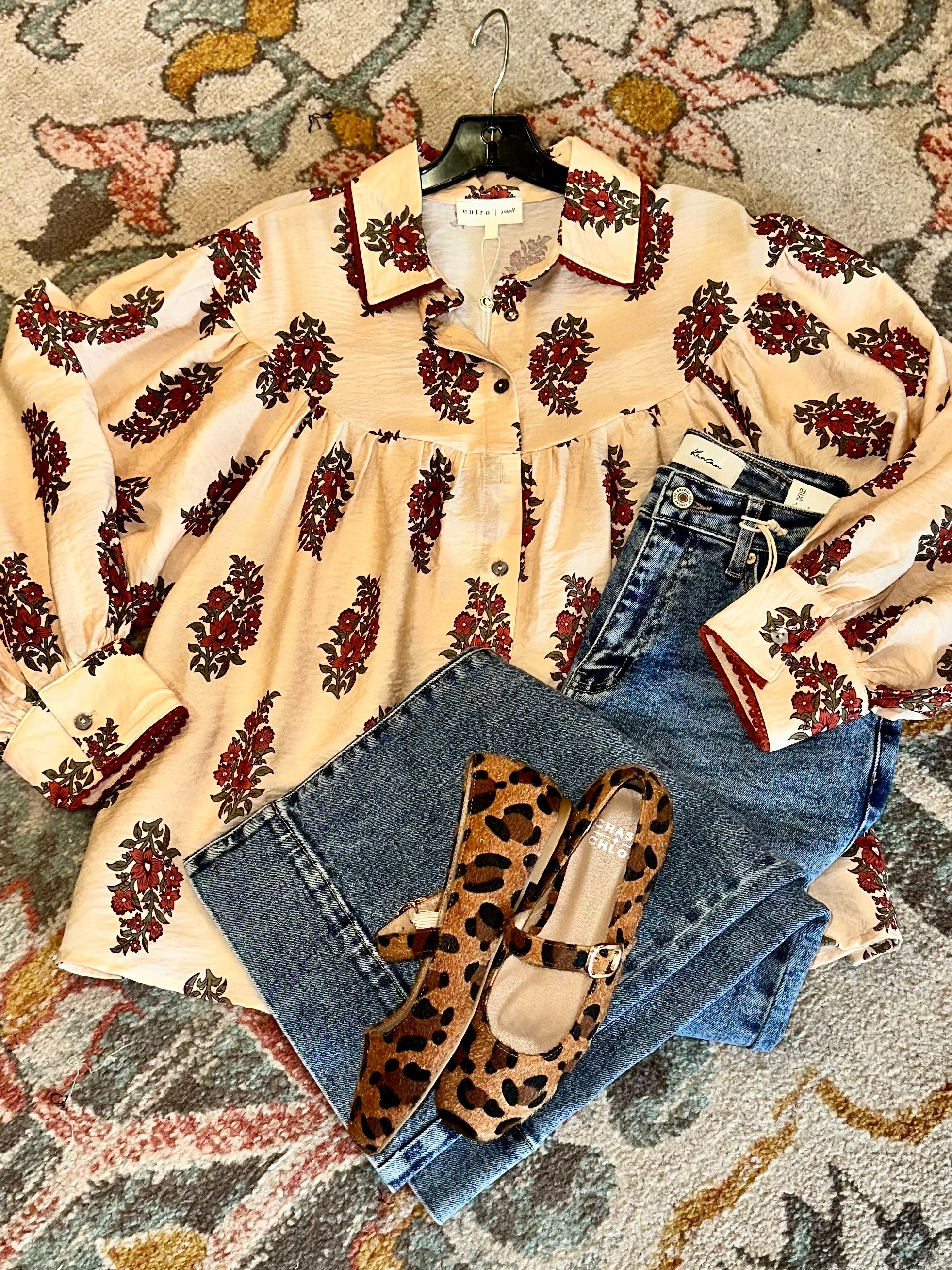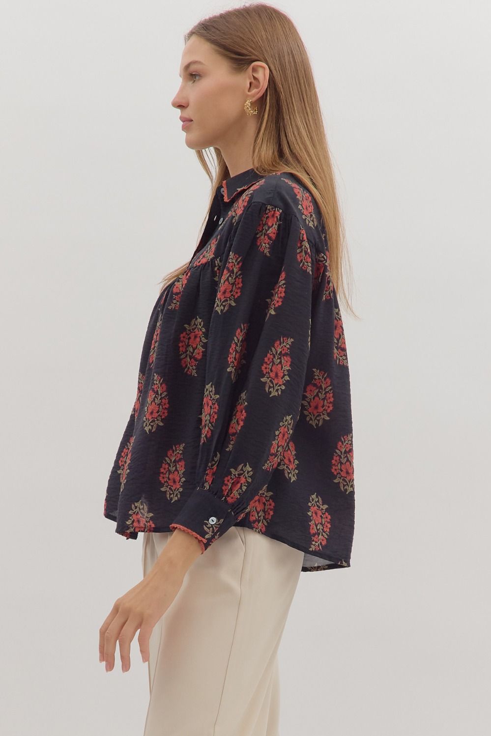 Floral print long sleeve button-down top featuring pleated yoke detail at front and back. Shirt collar.