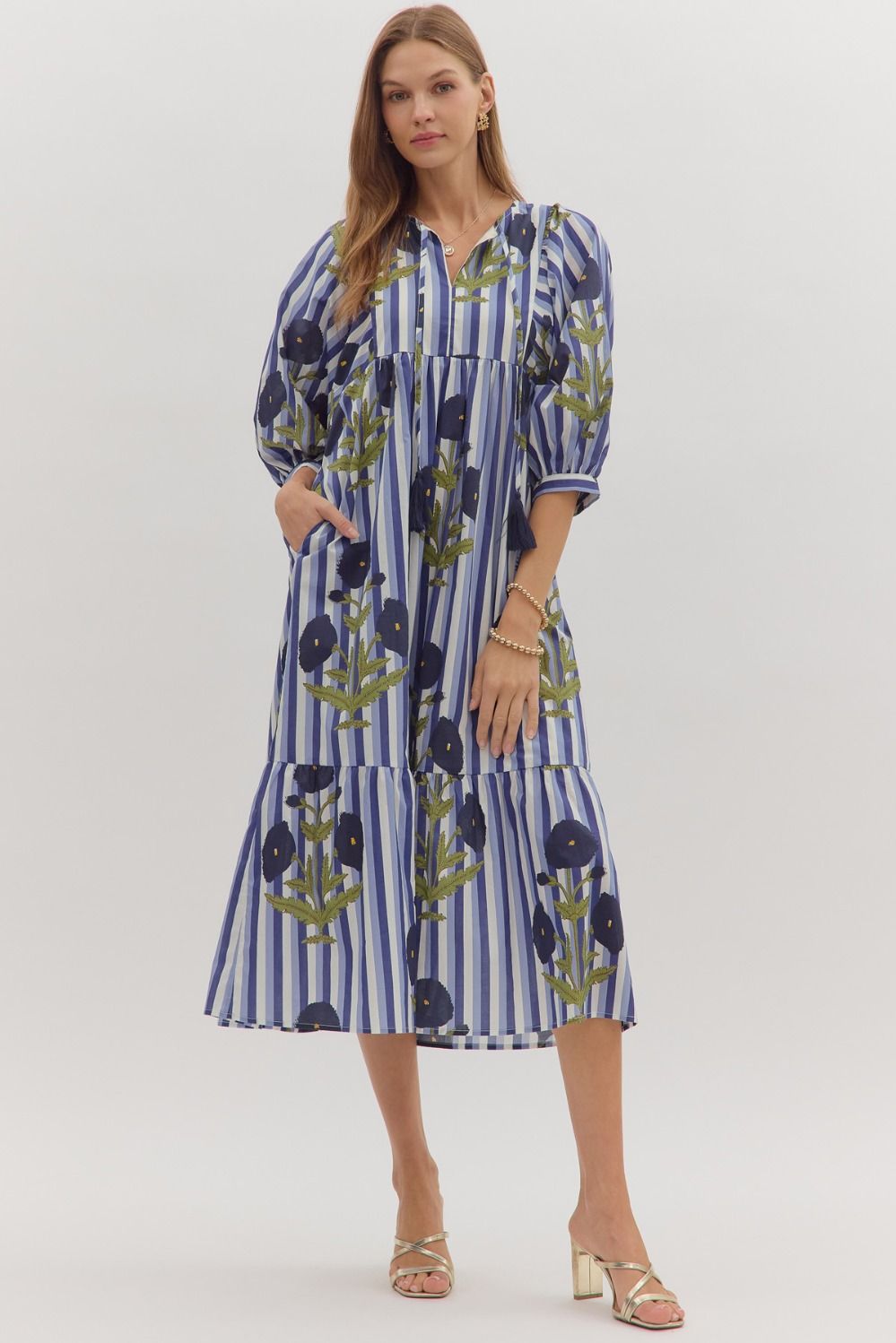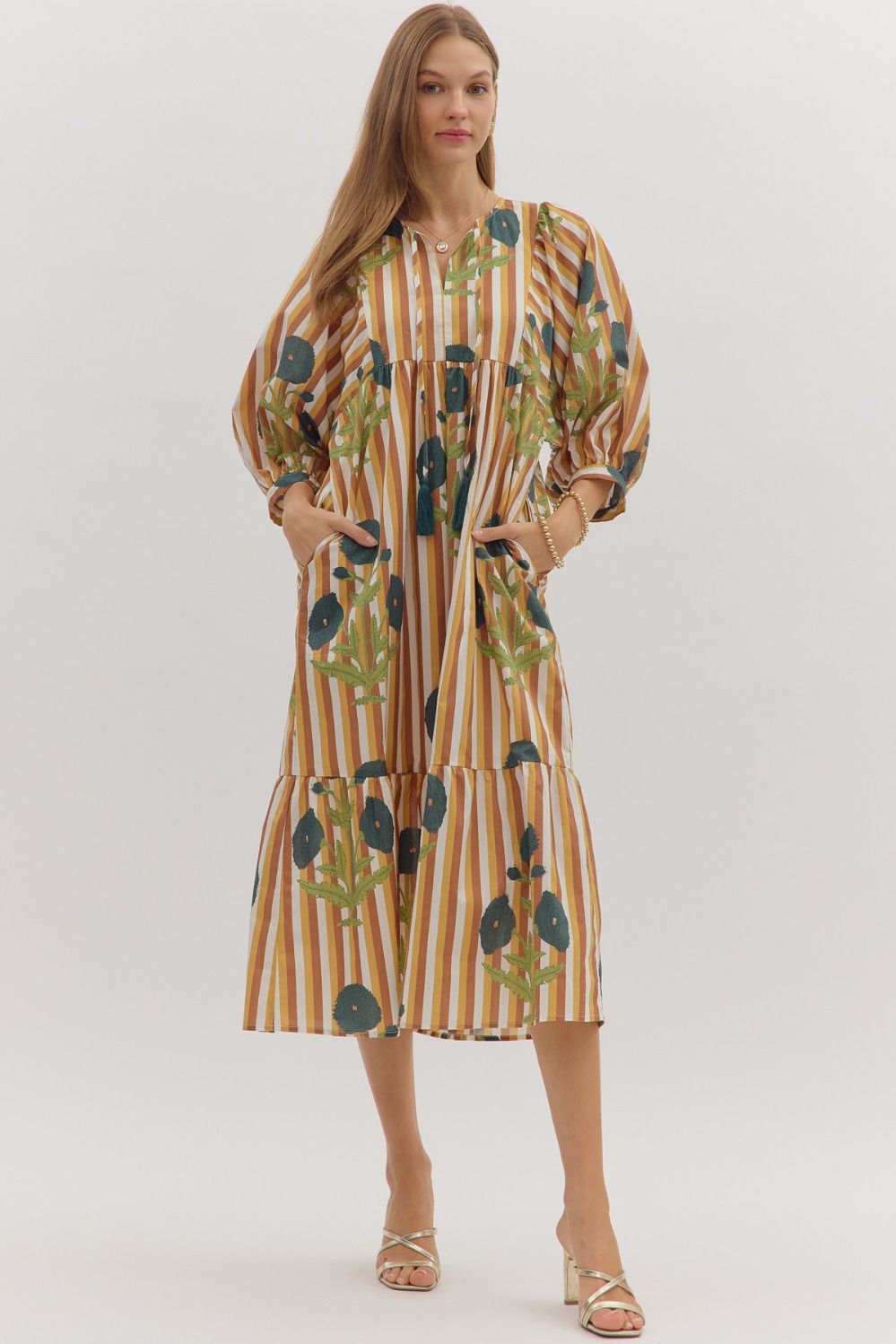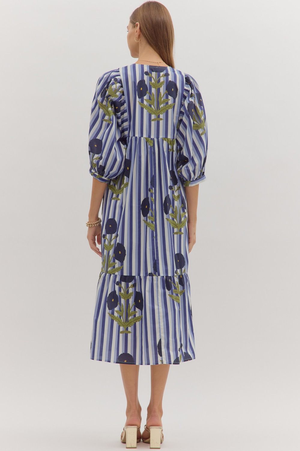Striped puff sleeve midi dress with allover floral print.