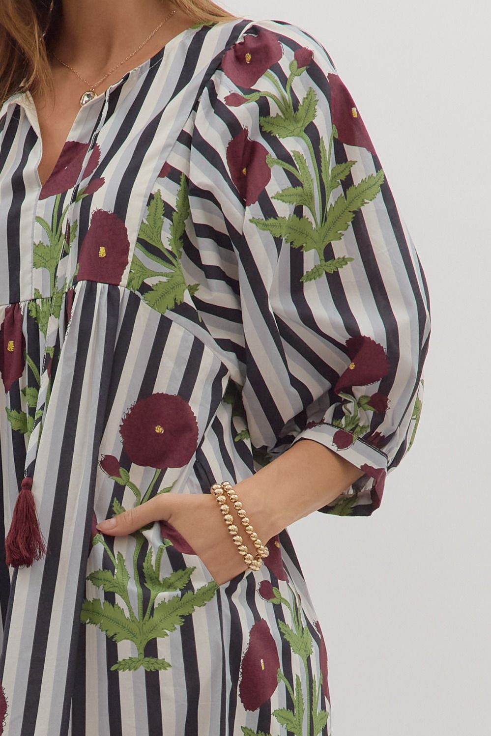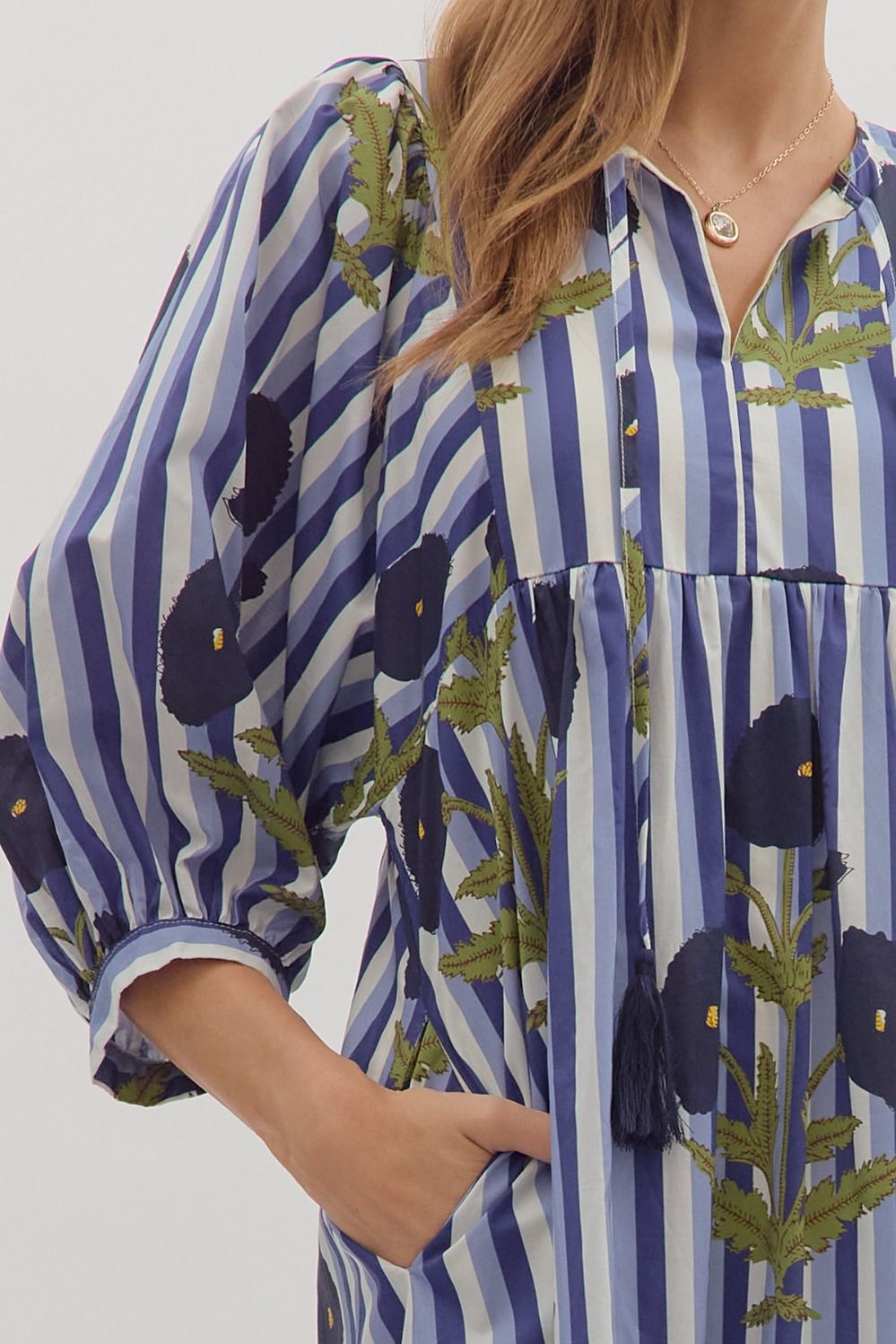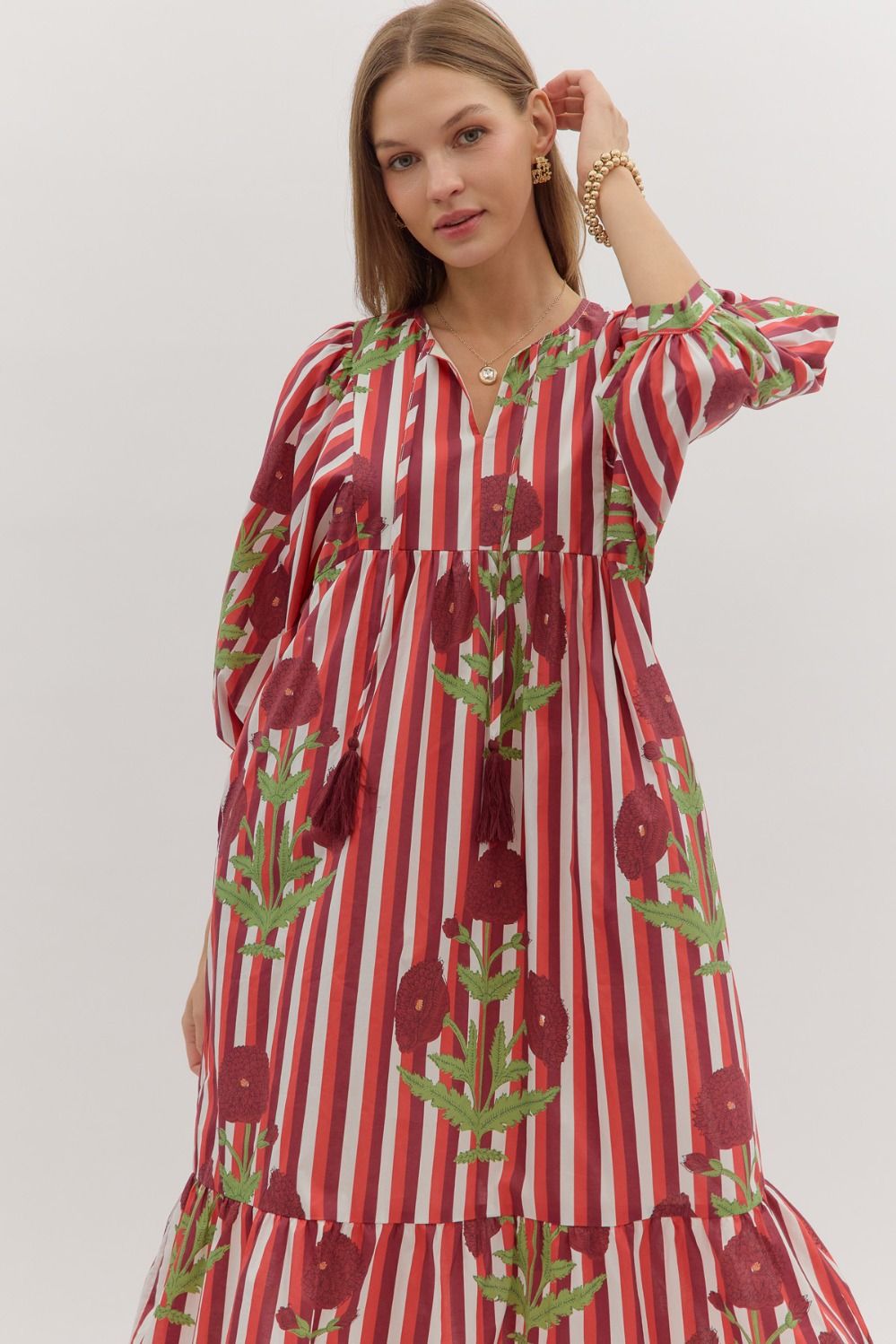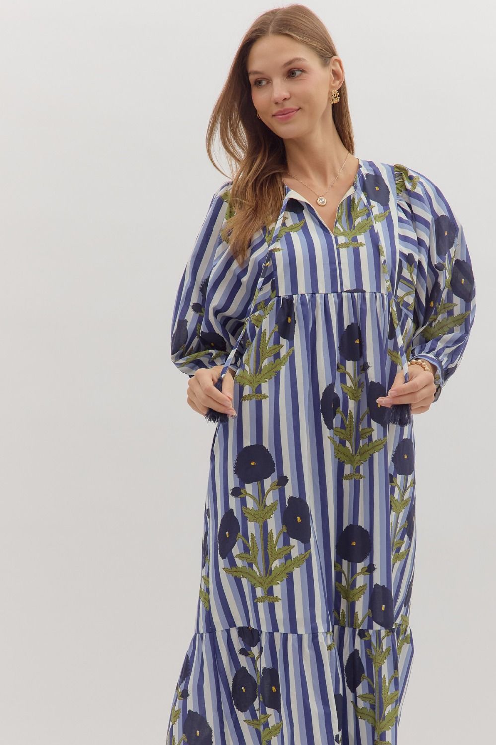 Striped puff sleeve midi dress with allover floral print.