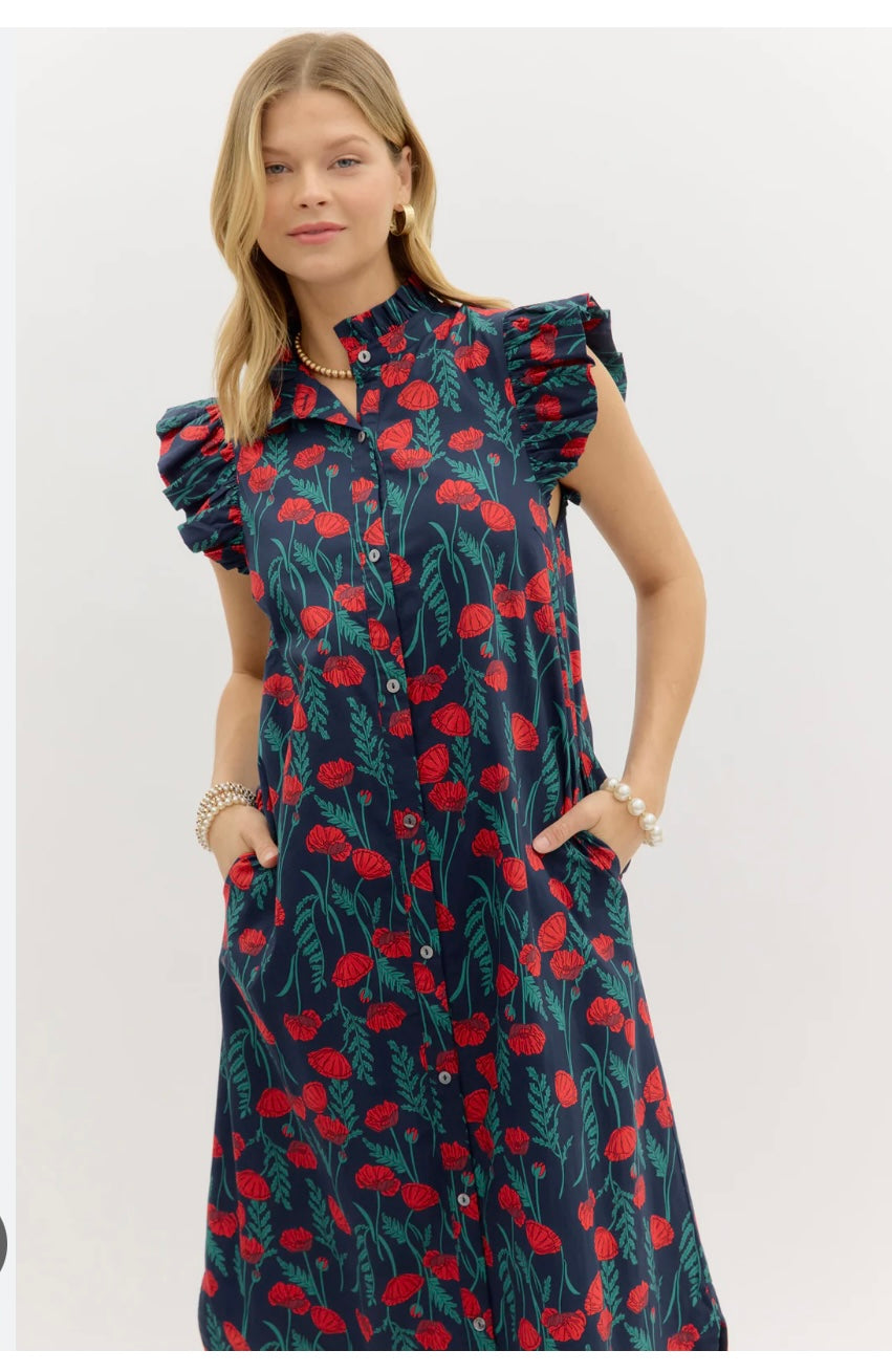 This playful navy midi dress features a charming red floral print that brings a pop of color to your look! The button front closure and ruffle trimmed mock neck add a flirty touch, while ruffle-capped sleeves keep things fun and playful. She's the perfect dress to blend style and comfort effortlessly!