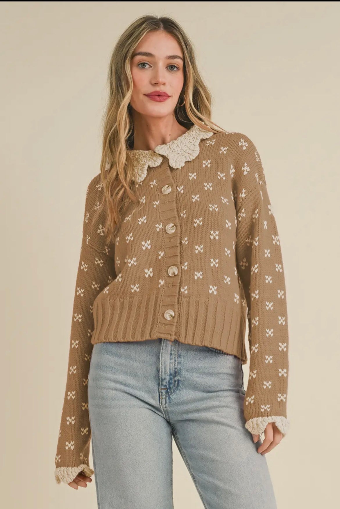 Chilly days are that much better when you've got this doll collar sweater cardigan! Cozy knit shapes this must-have cardigan that has doll collar neckline framed by drop shoulder long sleeves with scalloped cuffs. Covered, functional buttons adorn the front of the relaxed bodice.